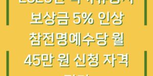 국가를 위해 헌신한 참전유공자 여러분께 감사의 말씀을 전합니다. 여러분의 희생과 노고에 대한 보답으로, 정부는 다양한 보훈 지원을 제공하고 있습니다. 2025년에는 국가유공자 보상금이 5% 인상되며, 참전명예수당은 월 45만 원으로 조정됩니다. 이번 …